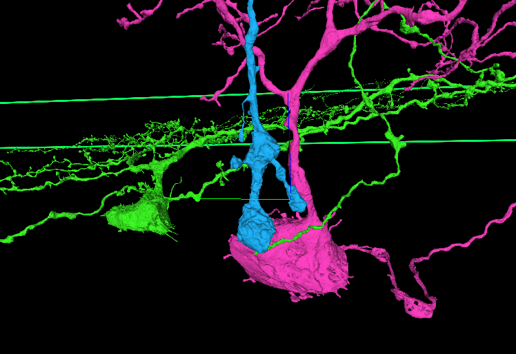 bipolar cells (yellow, different types), horizontal cells(pink - check the lil purple one it’s crazy!) and GCs blue