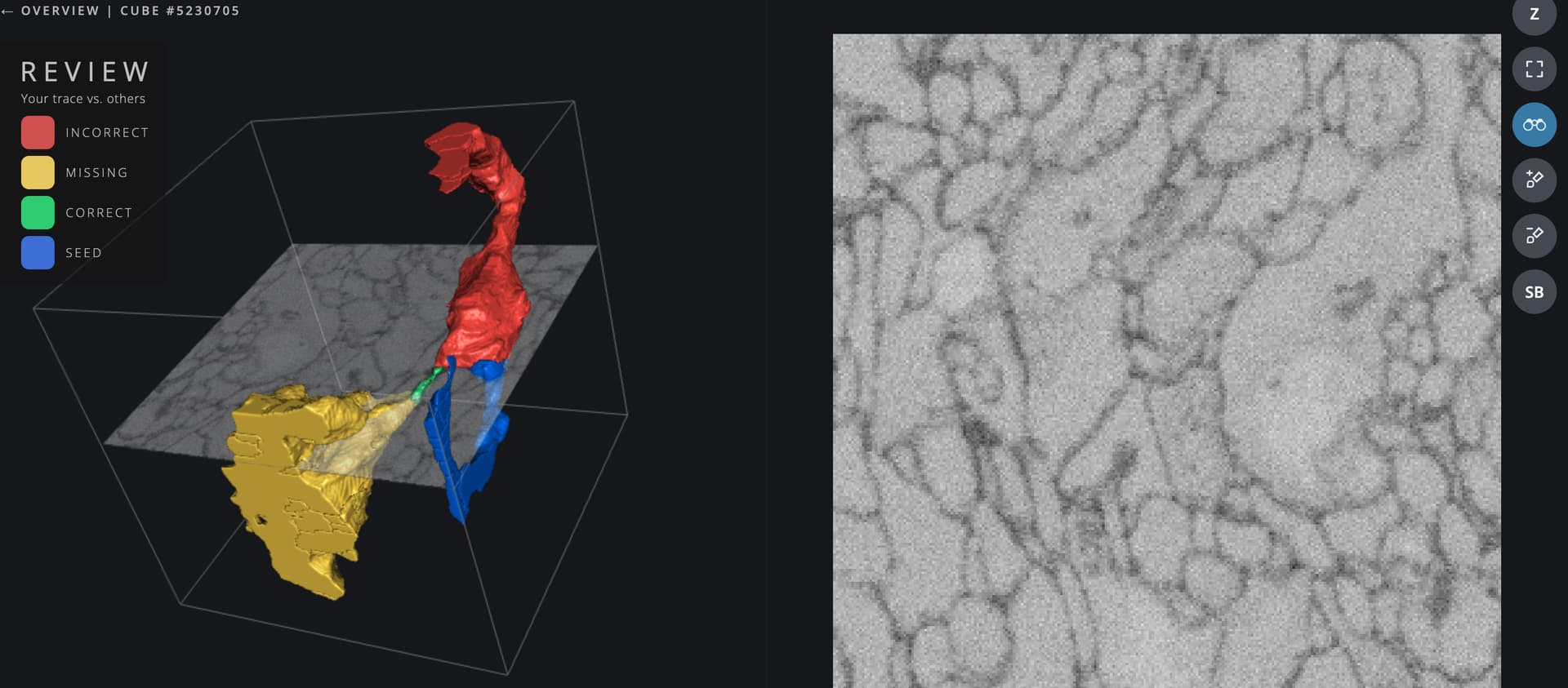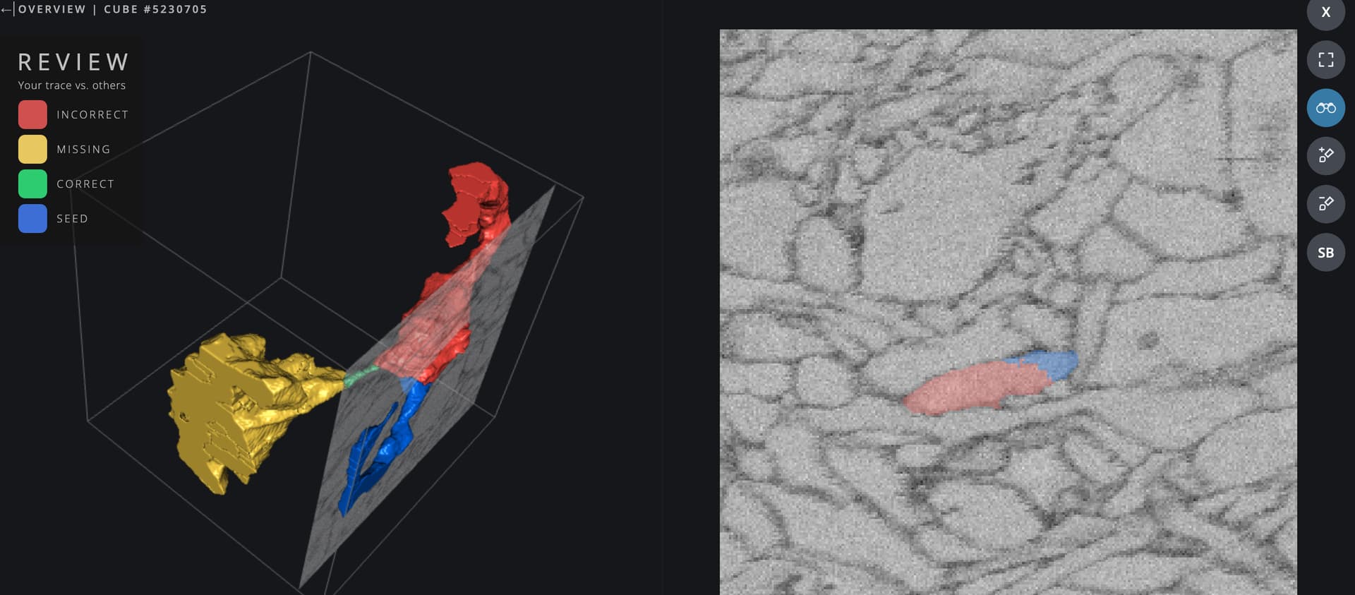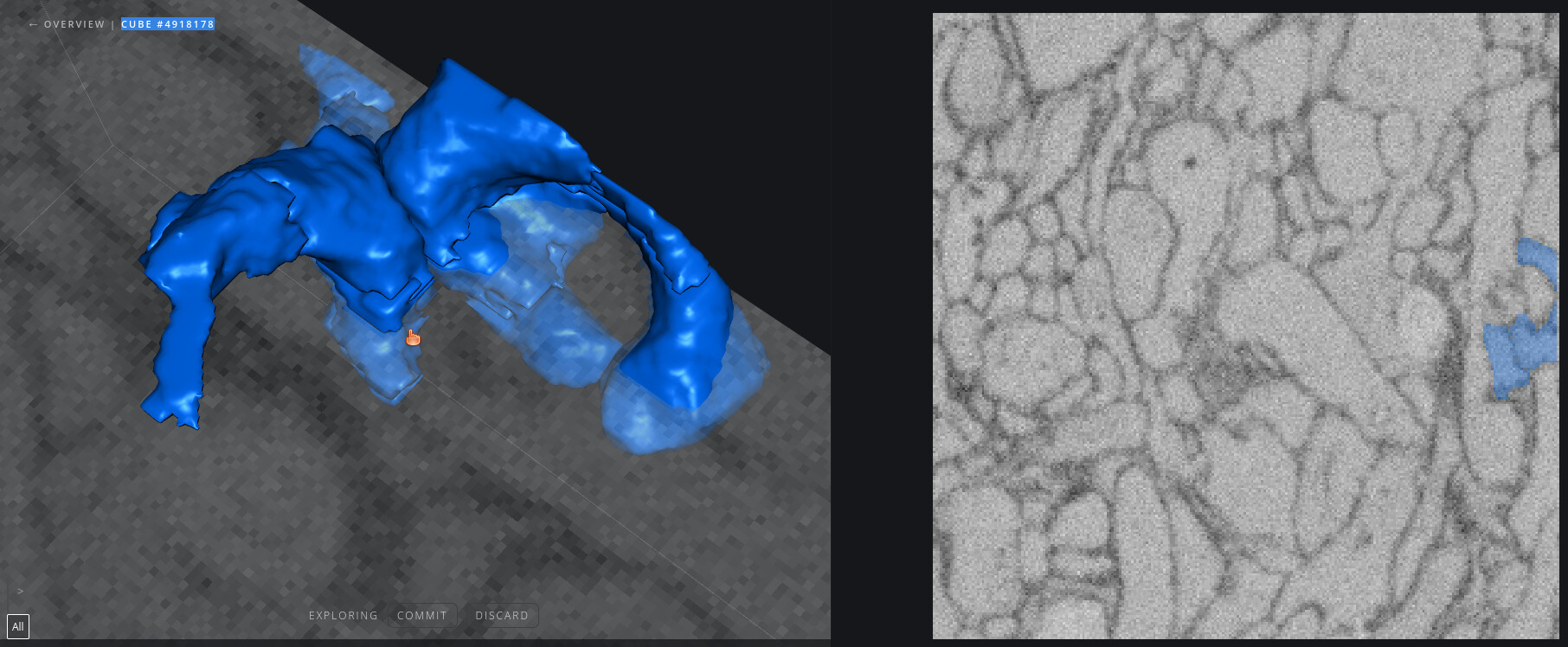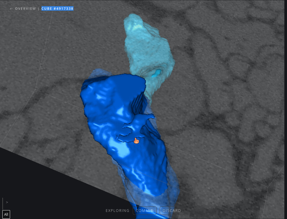 This cube was particularly tricky. While the red segment looks correct from most angles, it ended up leading to another cell where it truly belongs. There’s a very faint merger happening in the seed piece (dark blue) that can be easily missed, so the only way we found out it was a problem was when another cell starting growing! I’ve tried to circle where the error was, but this is a difficult faint outline to spot.