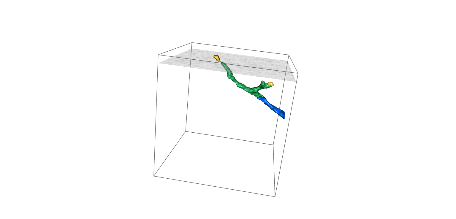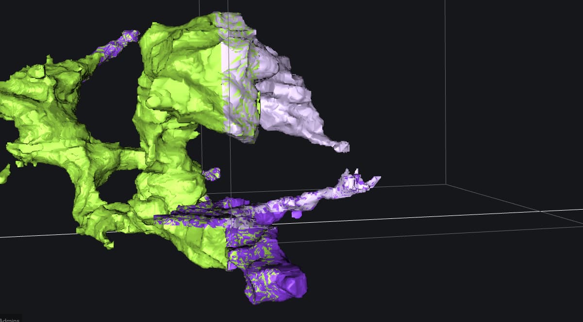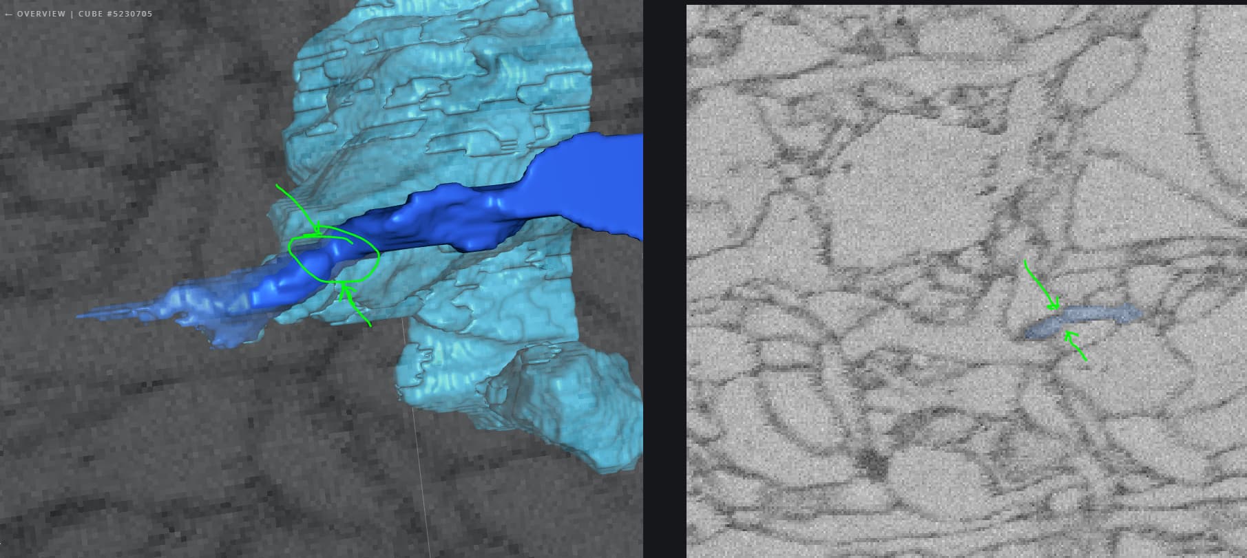 This cube was particularly tricky. While the red segment looks correct from most angles, it ended up leading to another cell where it truly belongs. There’s a very faint merger happening in the seed piece (dark blue) that can be easily missed, so the only way we found out it was a problem was when another cell starting growing! I’ve tried to circle where the error was, but this is a difficult faint outline to spot.