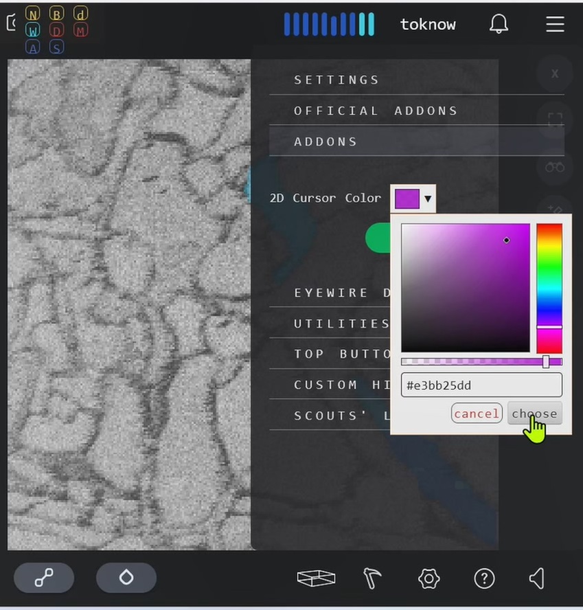 The cursor color in the 2D view of EyeWire lacks sufficient contrast with the background, making it difficult to see the cursor. If you want to change the cursor color, this script can help you: