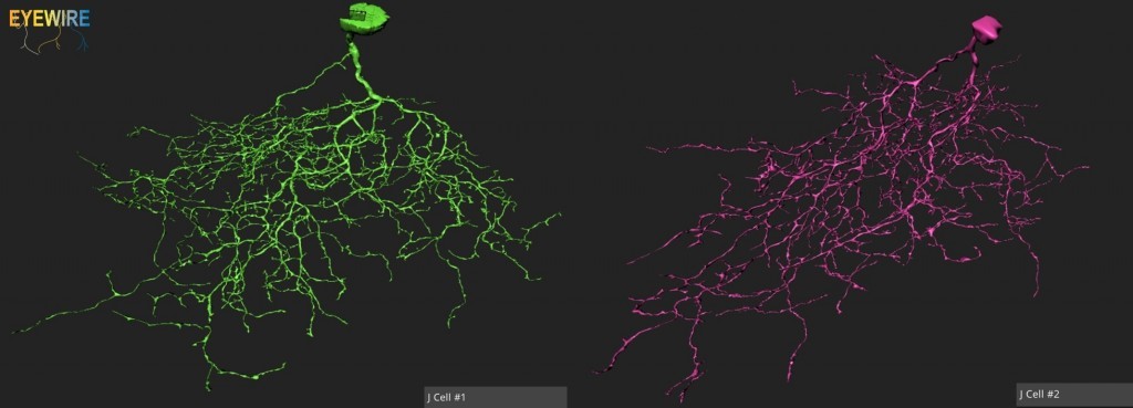 Before I answer your question, I’ve a question of my own: how come the transgenic mice were not used? It seems like it would have been useful to be able to determine the location of J-cells in order to make it easier to positively identify them, as well as map their distribution. Also, it would enable the comparison of the morphology of the symmetric J-cells and the asymmetric J-cells. I do not think it would be that hard (though I may be wrong) to combine serial block face-scanning electron microscopy with a method for identifying where the J-cells are. Just pass the slices from the ultramicrotome (or the blocks? Not sure what the configuration of the EM and the ultramicrotome are, so I don’t know which would easier to do in terms of space) under a photometer with a UV filter and a UV light source to measure the amount of YFP in the slice by the amount of light produced via fluorescence, and then construct a volumetric map of the resulting data, which would enable you to locate which cubes containing the cell bodies/neurites of the J-cells.